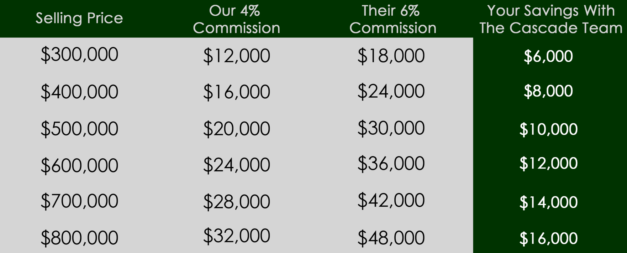 * 1% Listing fee + Buyer agent commission. Commissions vary by price point, so contact your Cascade Team agent for more information.