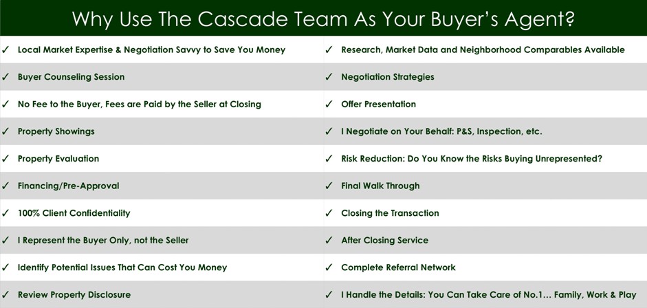 The Cascade Team is a real estate brokerage whose focus is centered on customer service. Our customer's are our number one priority and we work hard to not only find properties that meet your needs. We leverage our local market knowledge to help guide you through the home search process. Our commitment to excellence in service is unparalleled. While we offer a number of online tools to assist you with your home search, having a knowledgeable local agent to guide you is so important, especially when the market heats up. Multiple offers, escalation clauses, negotiations, etc, are all critical items in helping you secure your new home, and that's where our service and local knowledge sets us apart.